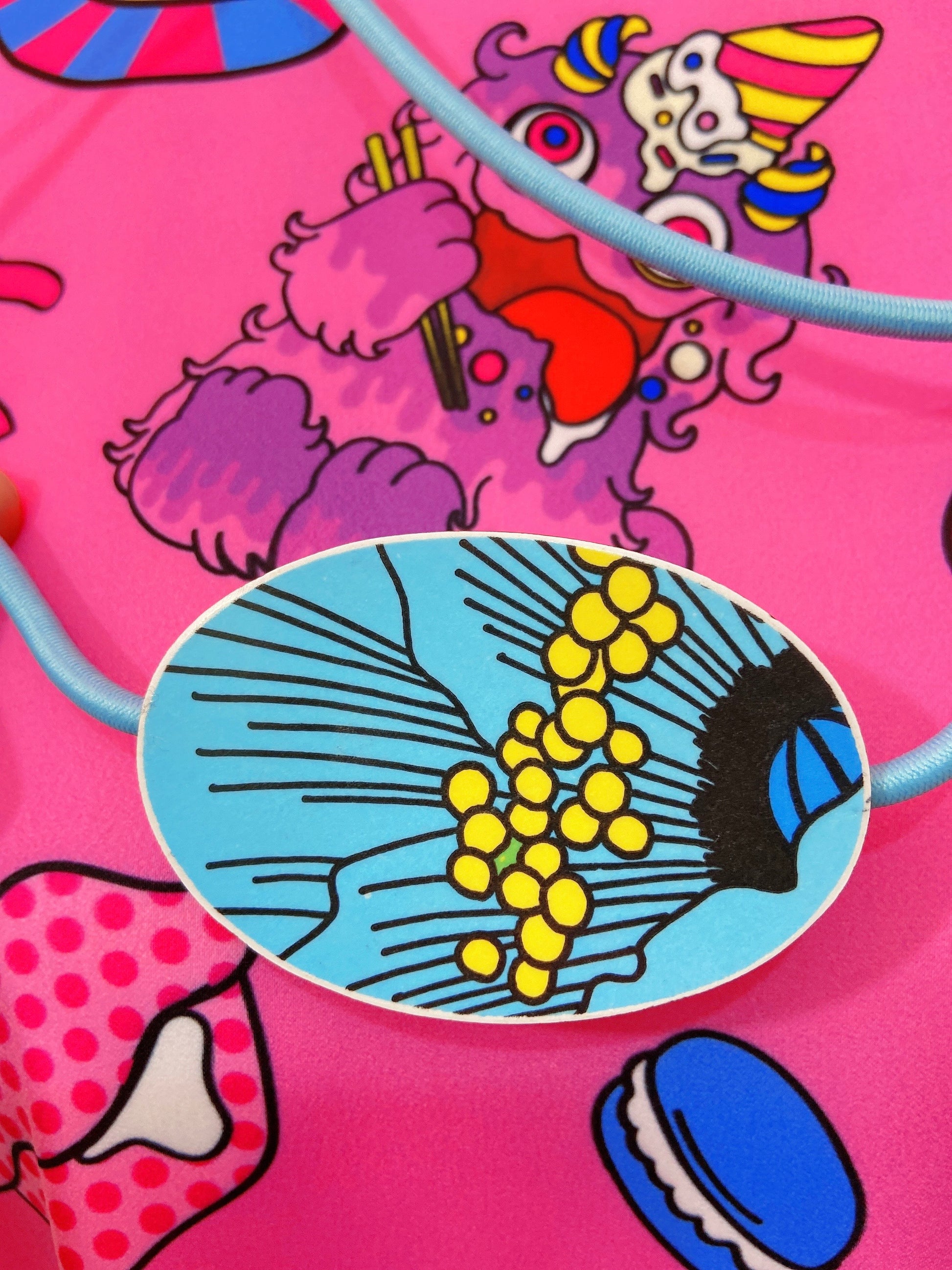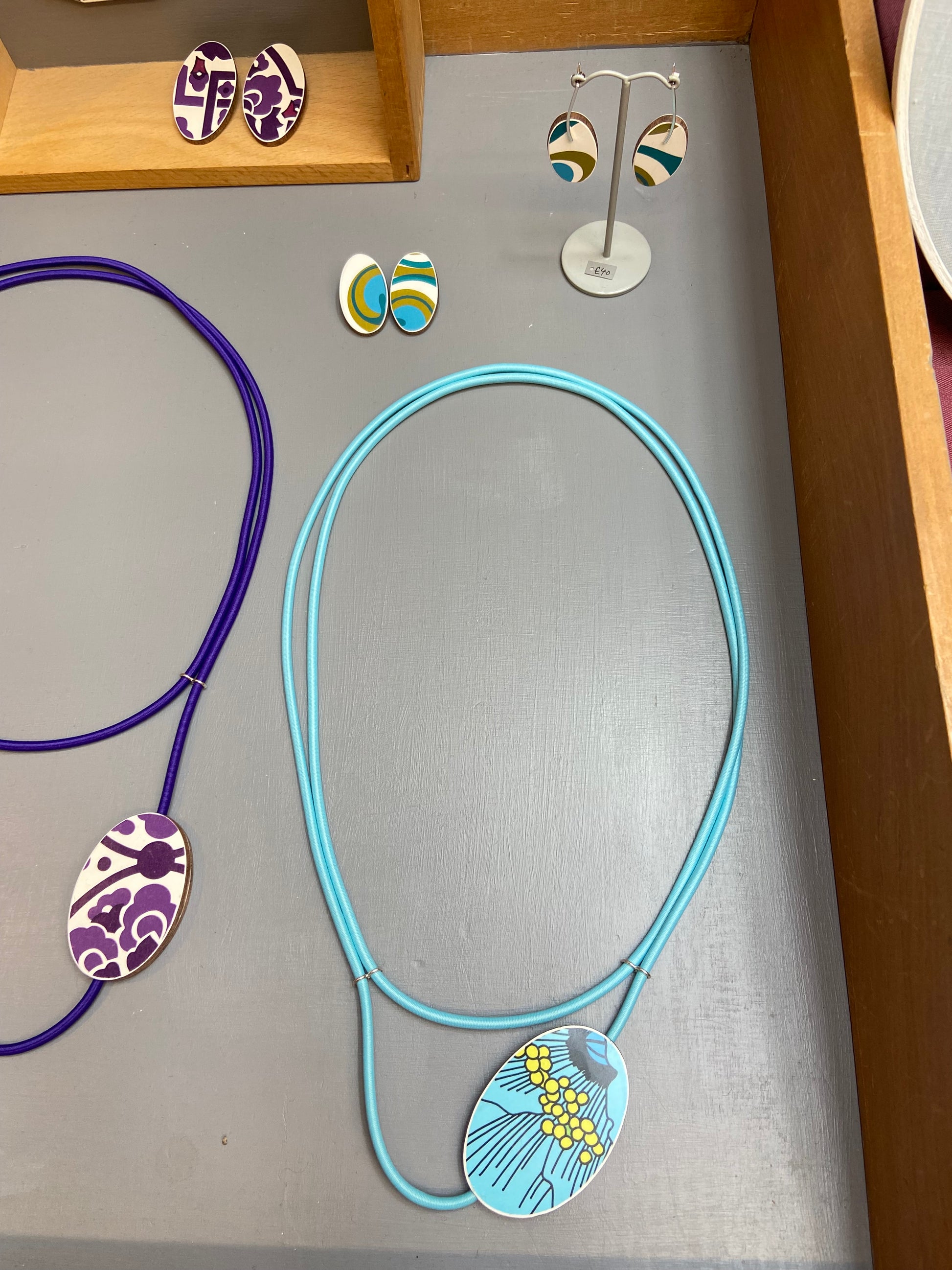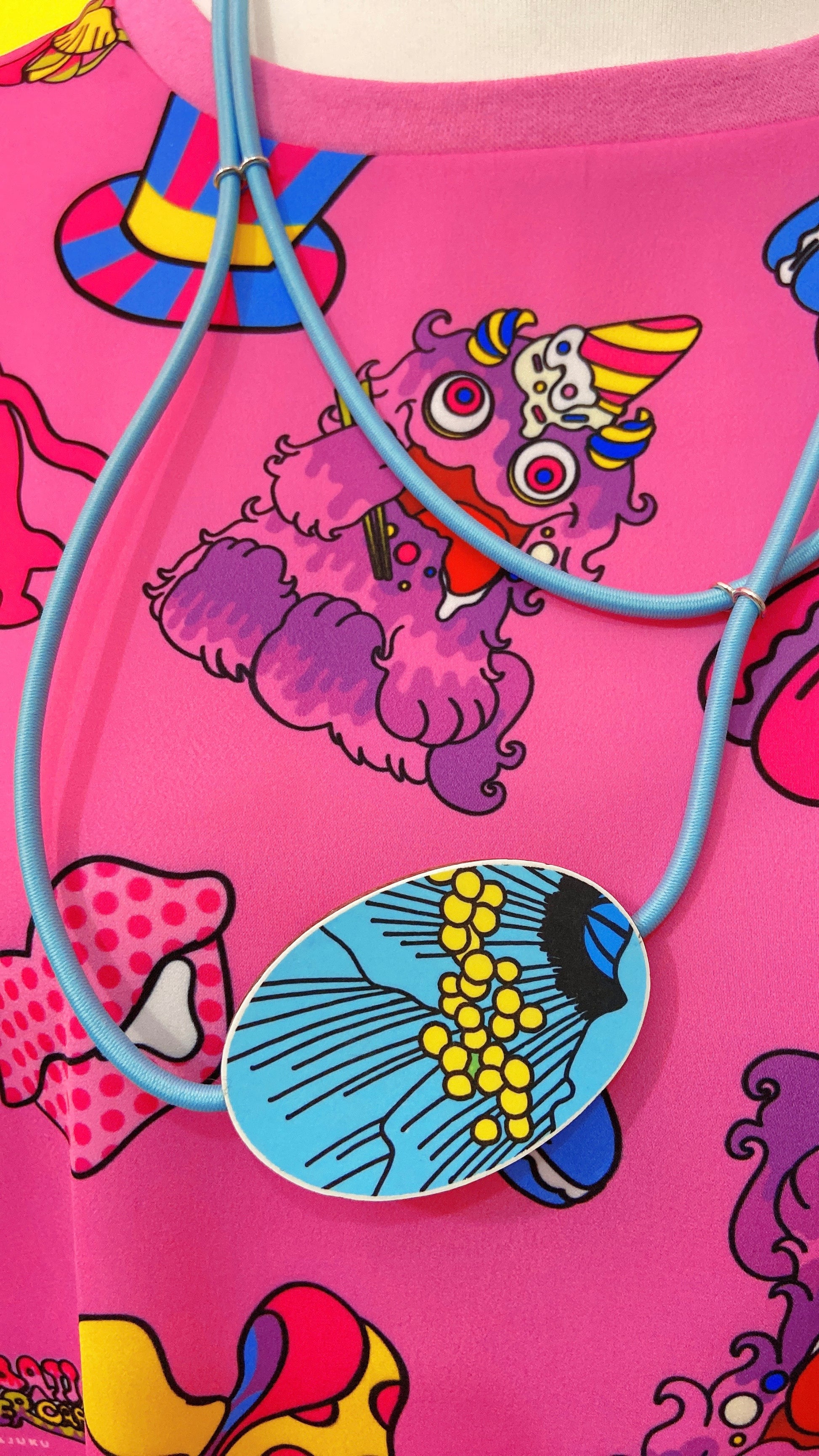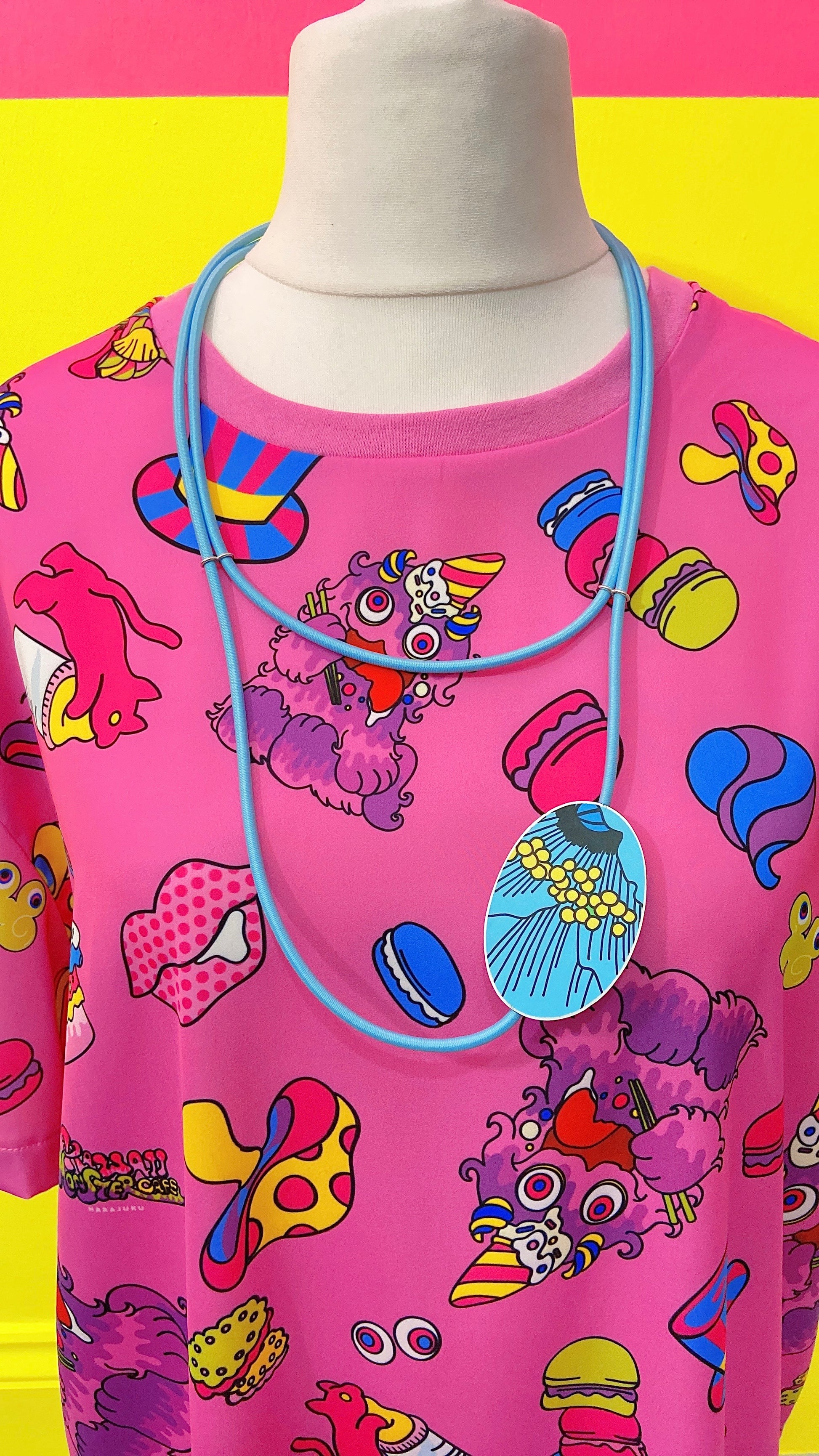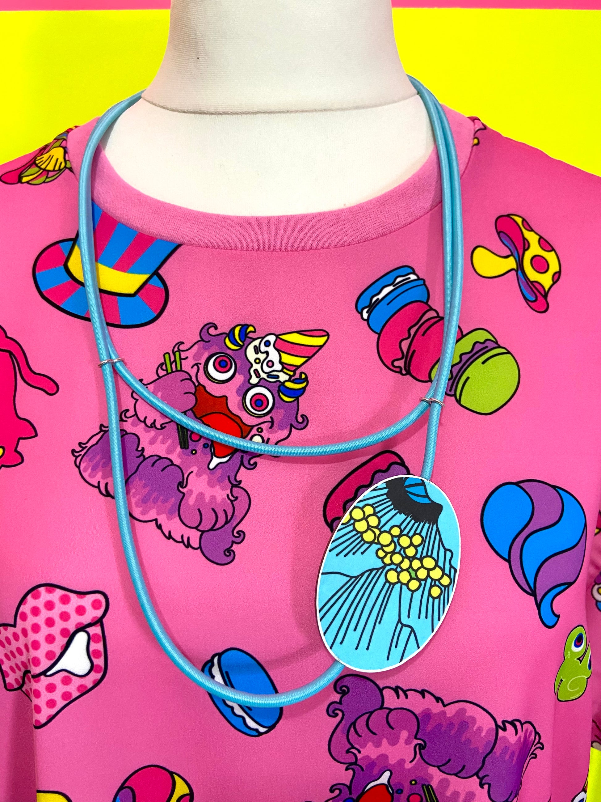 Elastic necklace from my Tablewear and www.grumpybunny.com collaboration. Each necklace is handmade from vintage melamine trays with a unique pattern on each side which makes the necklace reversable. The colourful elastic can be adjusted in length by moving the two sterling silver rings at the sides. By adjusting the rings you can also move the pendant so that it can be worn to the side giving it even more versatile wearability.